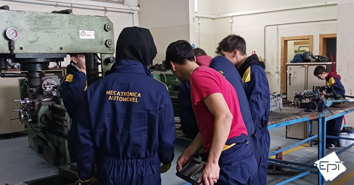 Aulas práticas do 10º ano do curso profissional de Técnico de Mecatrónica Automóvel, na disciplina de Práticas Oficinais, sob orientação do Eng.º Joaquim Cabral.