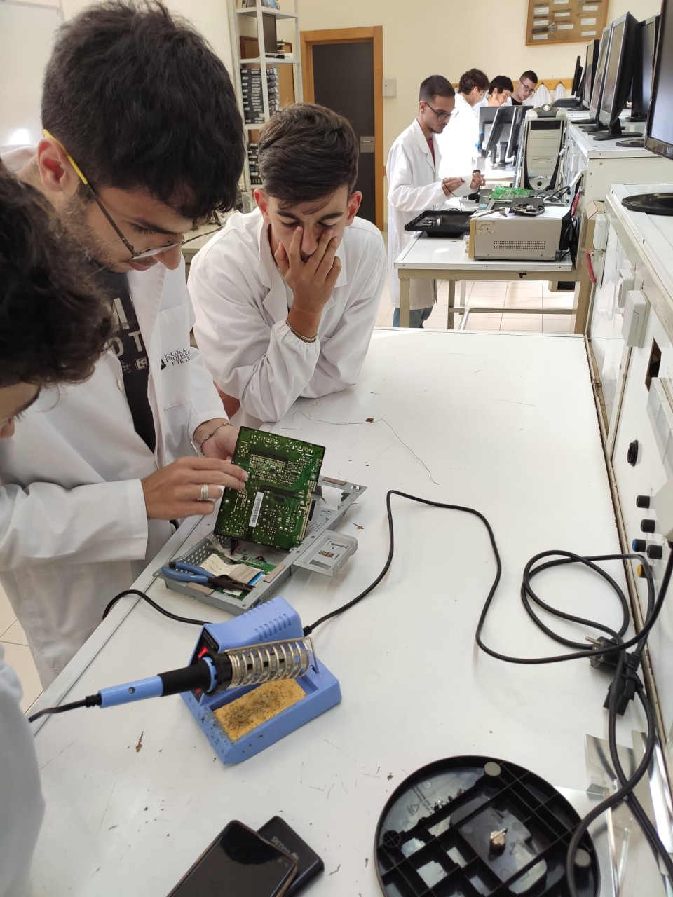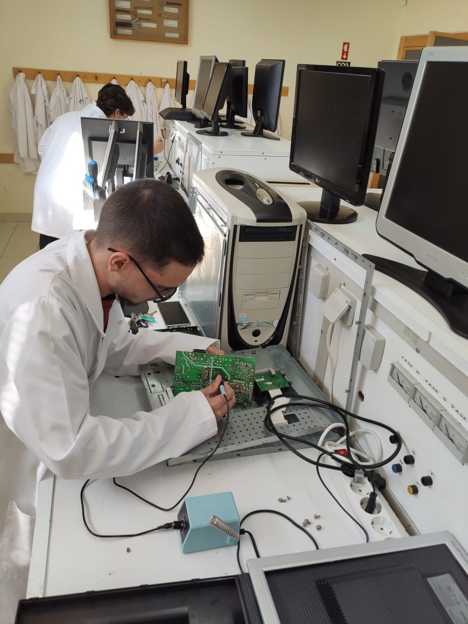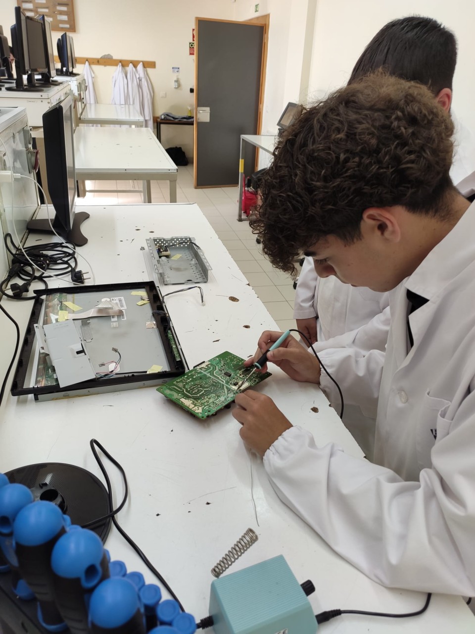 Os alunos do 12.º ano de Gestão de Equipamentos Informáticos estão a aprender e a praticar técnicas de diagnóstico e reparação de avarias, com o professor Daniel Mendes.