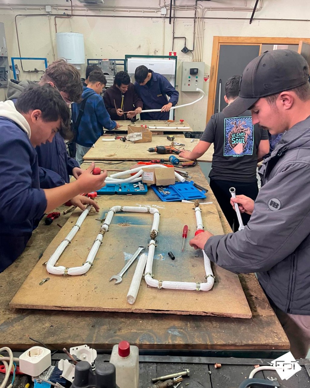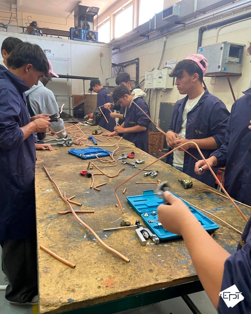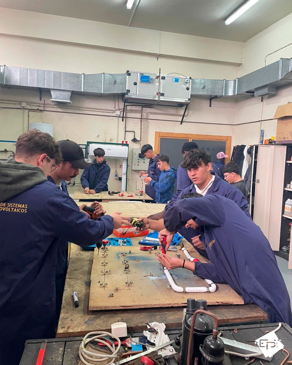 Durante as aulas práticas do 11.º ano do Curso Profissional de Instalador de Sistemas Solares Fotovoltaicos, os alunos aplicam os conhecimentos adquiridos, desenvolvendo competências essenciais em técnicas e ferramentas de ligação.