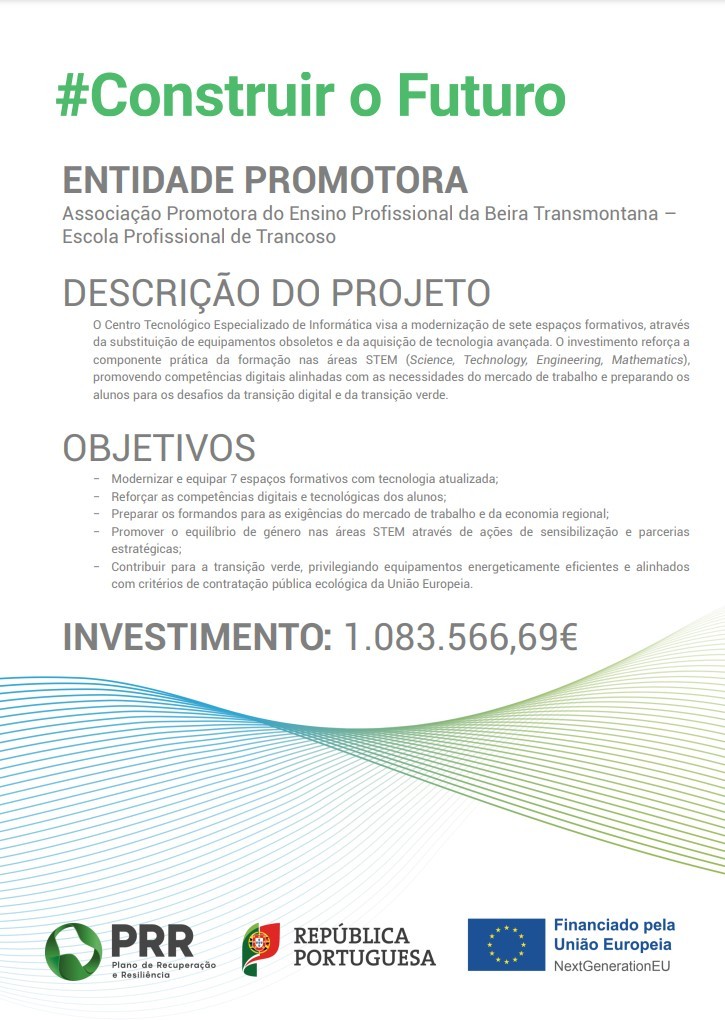 O Centro Tecnológico Especializado de Informática visa a modernização de sete espaços formativos, através da substituição de equipamentos obsoletos e da aquisição de tecnologia avançada. O investimento reforça a componente prática da formação nas áreas STEM (Science, Technology, Engineering, Mathematics), promovendo competências digitais alinhadas com as necessidades do mercado de trabalho e preparando os alunos para os desafios da transição digital e da transição verde.